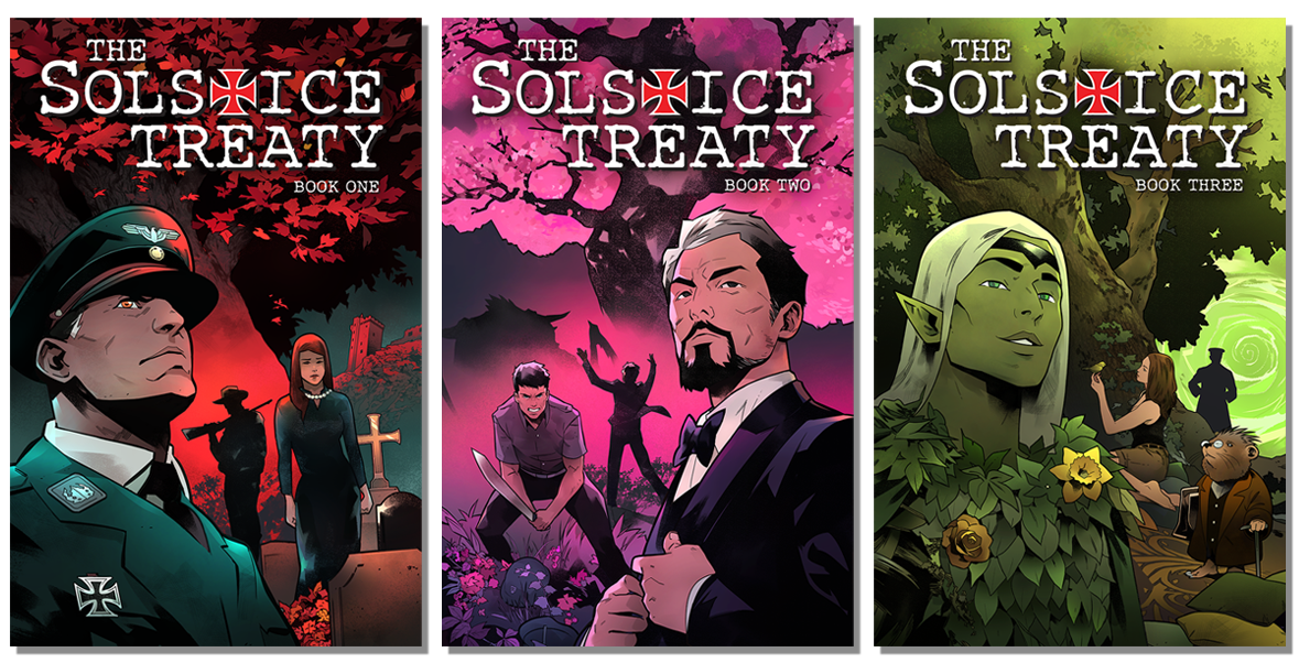 The Solstice Treaty is a six-volume graphic novel series (~80 pages each) that fuses urban fantasy, occult thriller, and alternate history. Written and lettered by Dave Marsh and illustrated and colored by Jacopo Cigarini, the series spans six books—three complete, with three in development. It’s crafted for readers who appreciate the intrigue of The Black Monday Murders and the mythic supernatural scope of Fables and B.P.R.D.